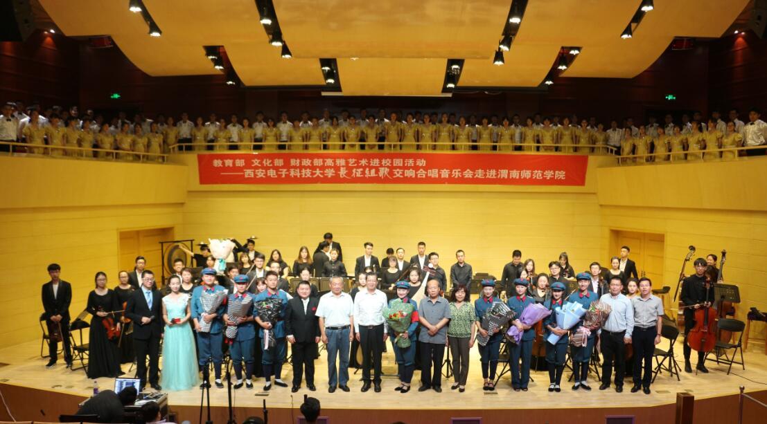 6月12日晚,由教育部、文化部、财政部主办的2017年高雅艺术进校园活动——西安电子科技大学长征组歌交响合唱音乐会在bat365官网华金音乐厅举行,西安电子科技大学党委副书记龙建成,bat365官网党委书记张金安、党委副书记赵伏友、副校长权雅宁、学术委员会主任王菊霞,西安电子科技大学团委书记朱文凯出席活动,相关部门、部分二级学院领导及五百余名学生代表观看演出。