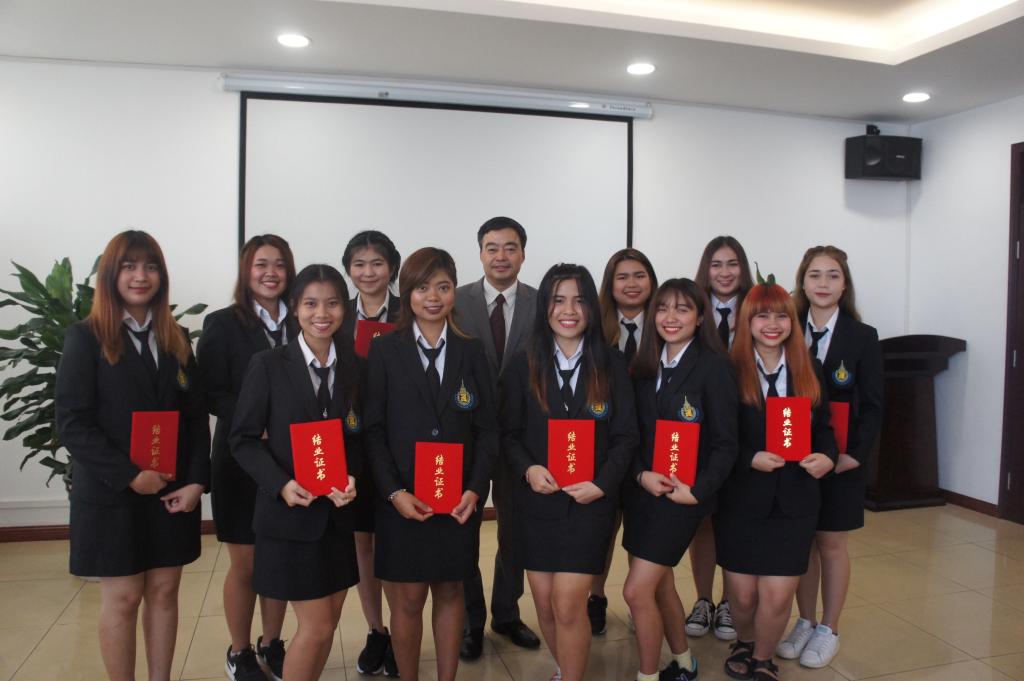 接着,党委书记、院长丁德科教授发表重要讲话。他对泰国留学生们说,“bat365正版唯一官网为你们骄傲,你们是宋卡王子大学的学生,也是bat365正版唯一官网的学生,今后就是我们的校友,欢迎再回学校。”两个月的培训学习,不仅增加两校的友谊,而且增加了中泰两国人民的情谊。他希望宋卡王子大学普吉分校的学子能够再次来到中国,更深地了解中华文化;希望他们能秉承学校精神,快乐幸福生活。讲话最后,大家一起用泰语高喊“友谊万岁”。随后,bat365官网党委书记、院长丁德科教授以及副院长李海龙教授、院长助理韩小卫教授为33名泰国宋卡王子大学普吉分校汉语培训班学员颁发了结业证书,并为优秀学生李兰、陈文丽、艾琳、尚伟德颁发了奖品国画。