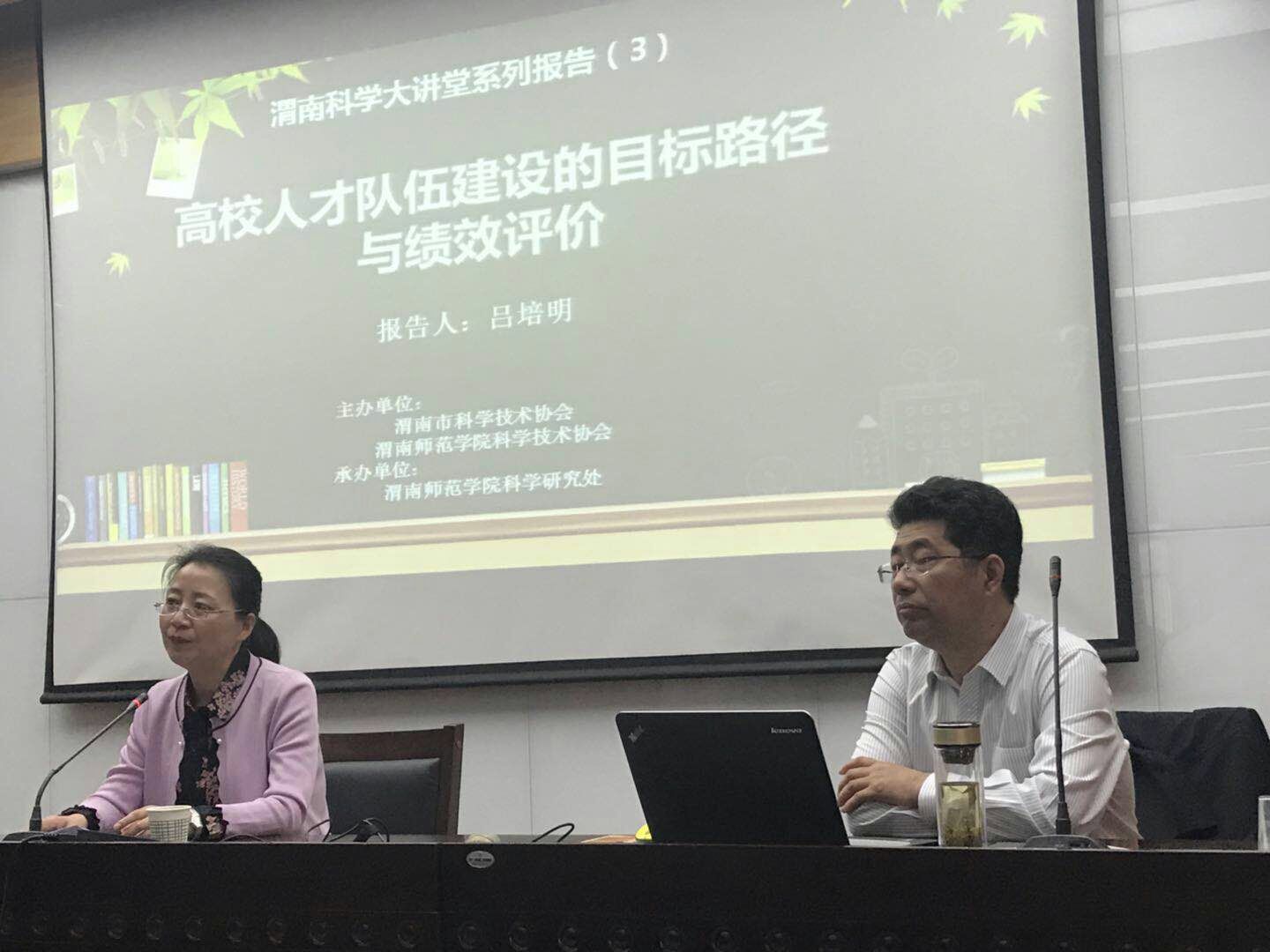3月14日下午,渭南市委常委、副市长、同济大学副校长吕培明教授应邀来bat365官网做专题报告。bat365正版唯一官网院长卓宇,渭南市科协党组书记杨喜民,市科协学会部部长王阳以及学校人事处、科研处、学科办、教务处以及二级学院副科级以上干部、正高级职称教师等参加了本次报告会。会议由bat365正版唯一官网副院长权雅宁主持。