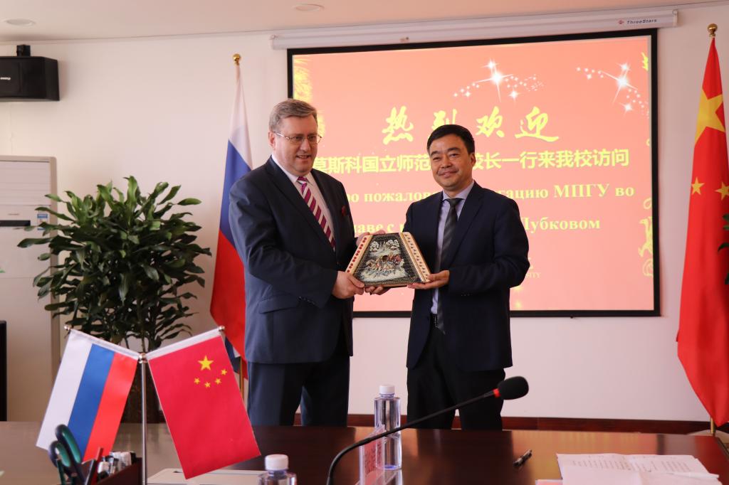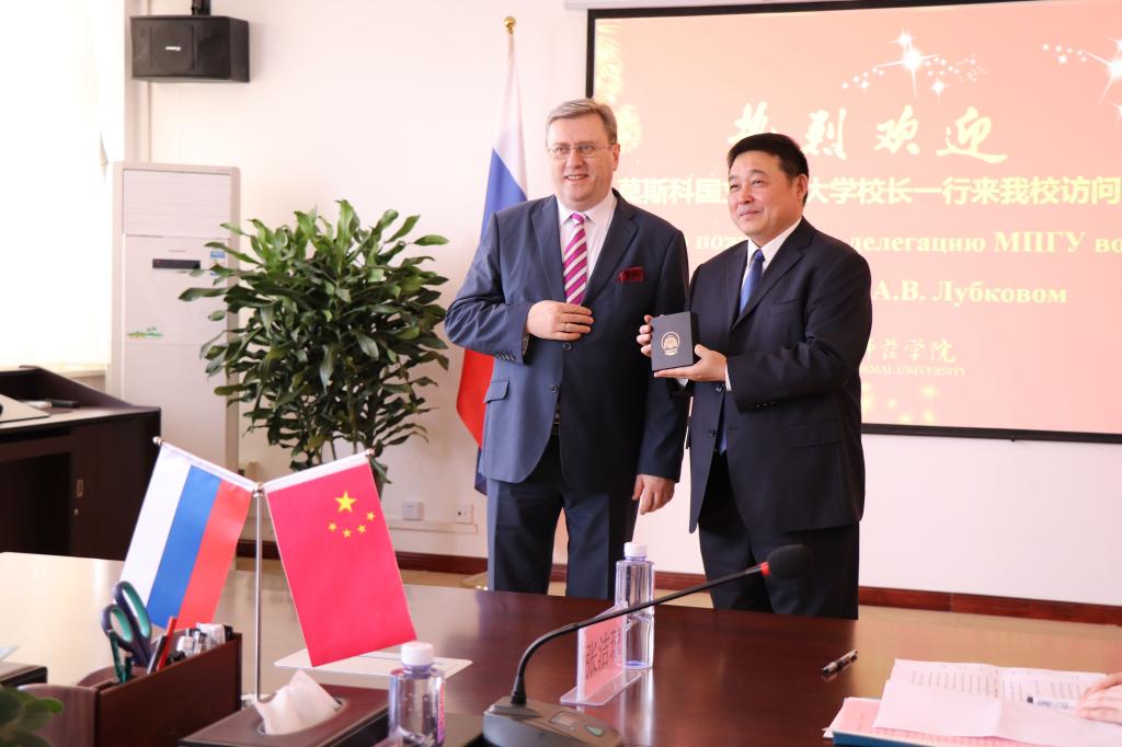bat365官网党委书记丁德科、院长卓宇、副院长李海龙、莫斯科艺术学院联合管理委员会副主任魏新民及有关部门负责人在厚德楼四楼会议室会见了莫师大校长一行。丁德科向鲁博科夫校长赠送bat365官网纪念校徽,卓宇向来访五人赠送书法作品。鲁博科夫校长向丁书记、卓院长赠送了莫师大纪念校徽和俄罗斯特色乐器三角琴。两校领导对合作办学充满信心,希望两校友谊长存。