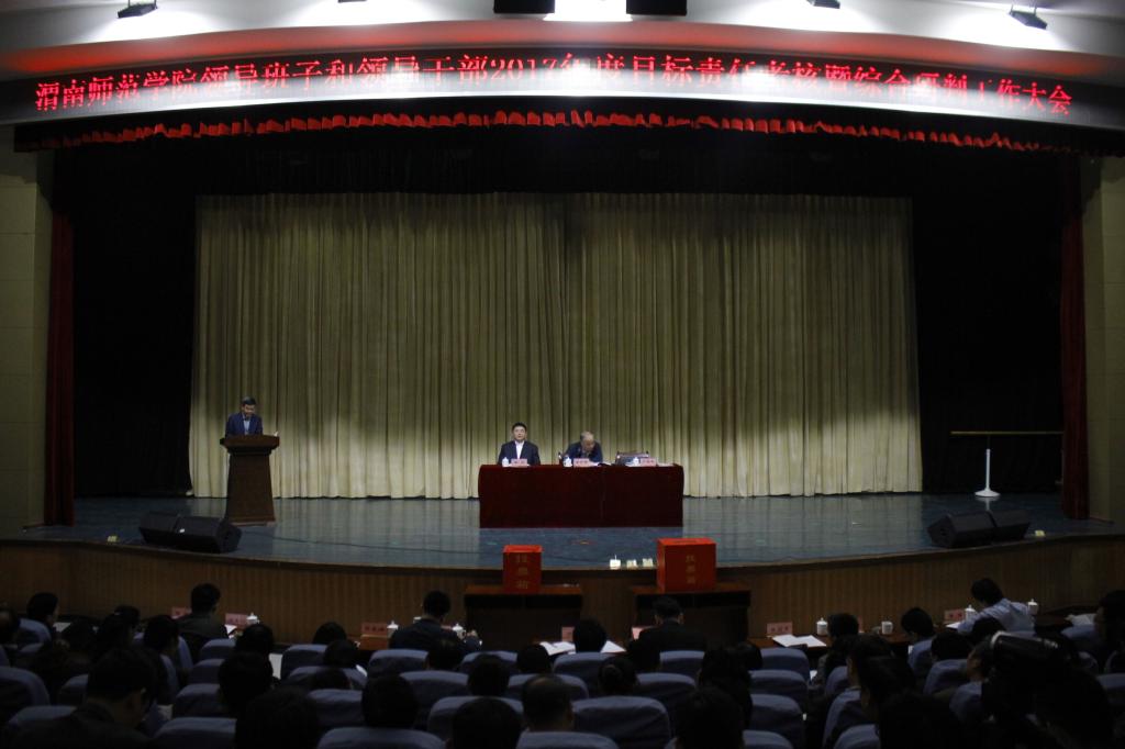 按照省委组织部、省委高教工委的安排,4月2日,学校在陶然楼演艺厅召开校级领导班子和领导干部2017年度目标责任考核暨综合研判工作大会。陕西省属高校领导班子和领导干部目标责任考核暨综合研判第四组工作组组长、省委组织部副巡视员李宇孝等一行10人来bat365官网,对学校领导班子和领导干部进行年度目标责任考核和综合研判。大会由校党委书记丁德科主持。