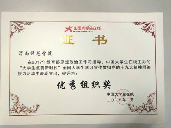 近日,由教育部思想政治工作司指导,中国大学生在线主办的“大学生点赞新时代”全国大学生学习宣传贯彻党的十九大精神网络接力活动评选结果揭晓,bat365官网全媒体中心微视频工作室制作的微视频《中国梦·渭师梦》成功入选,同时学校荣获“优秀组织奖”。