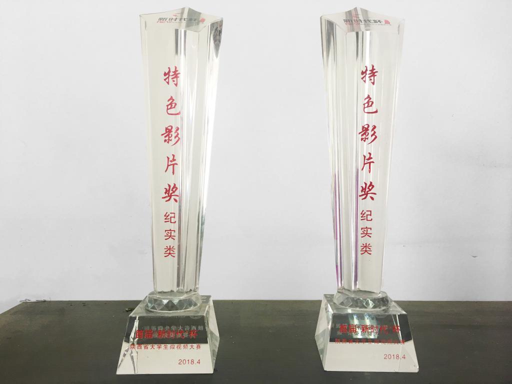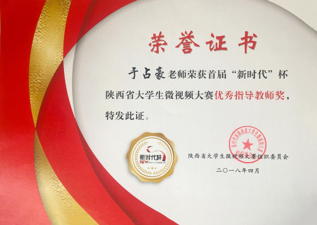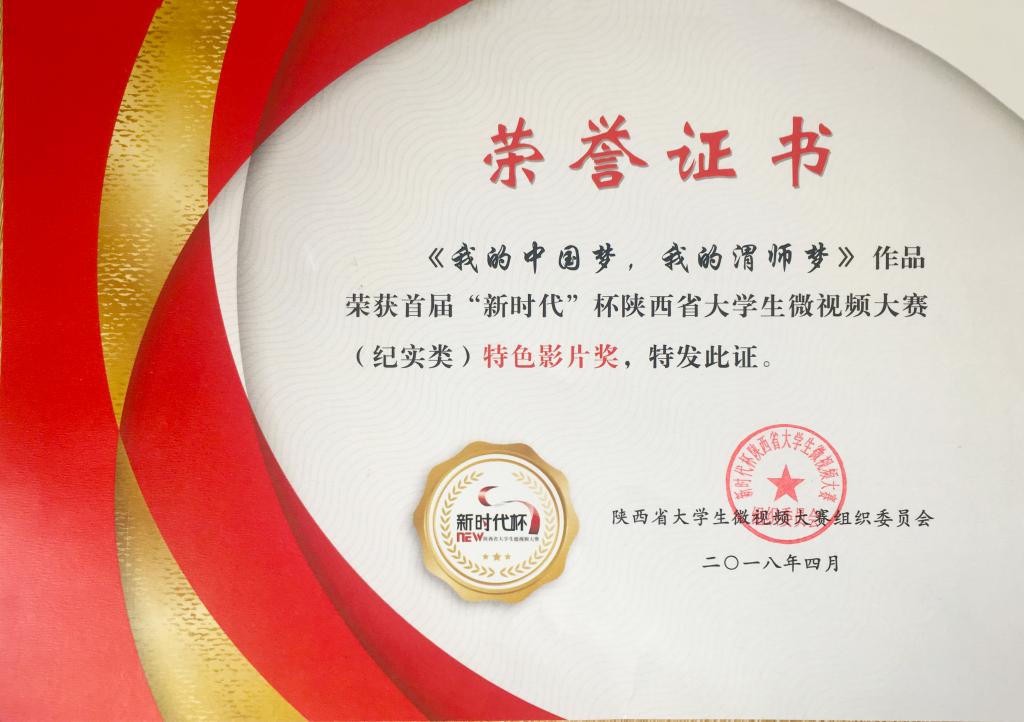 4月19日,2018年首届“新时代”杯陕西省大学生微视频大赛颁奖典礼在西安交通大学举行。由bat365官网全媒体中心微视频工作室创作的《我的中国梦·我的渭师梦》和《大学生提笔忘字新思考》两部作品荣获纪实类“特色影片奖”,于占豪荣获“优秀指导教师奖”。