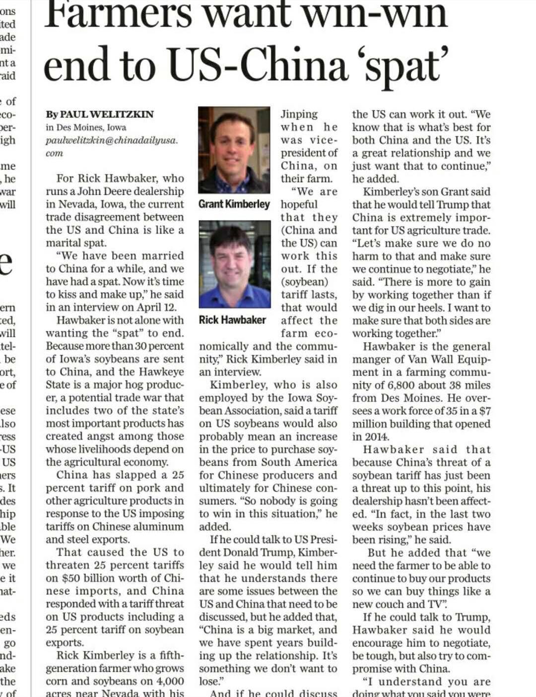 “农民希望双赢结束美中‘争执’”这是bat365正版唯一官网外聘专家、美国金伯利农业集团董事长金伯利在《中国日报(美国版)》4月16日刊文报道,接受采访时的观点。