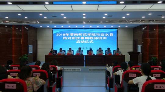 仪式上,渭南师院扶贫办副主任李铁丁指出渭南师院与白水县结对帮扶教师培训工作是认真贯彻省委 “双百工程”,在智力、教育、人才、科技、信息、文化、民生、志愿服务活动八个方面中开展精准施策,师资培训是教育扶贫中的一项重要活动,在2017年暑期教师培训工作的基础上,渭南师院继续教育学院与白水县教育局经过多次协商,制订了本次培训方案,确定了培训时间和培训内容,精心筛选出域内外27位专家利用10天时间对970名中小学、幼儿园教师集中进行培训。