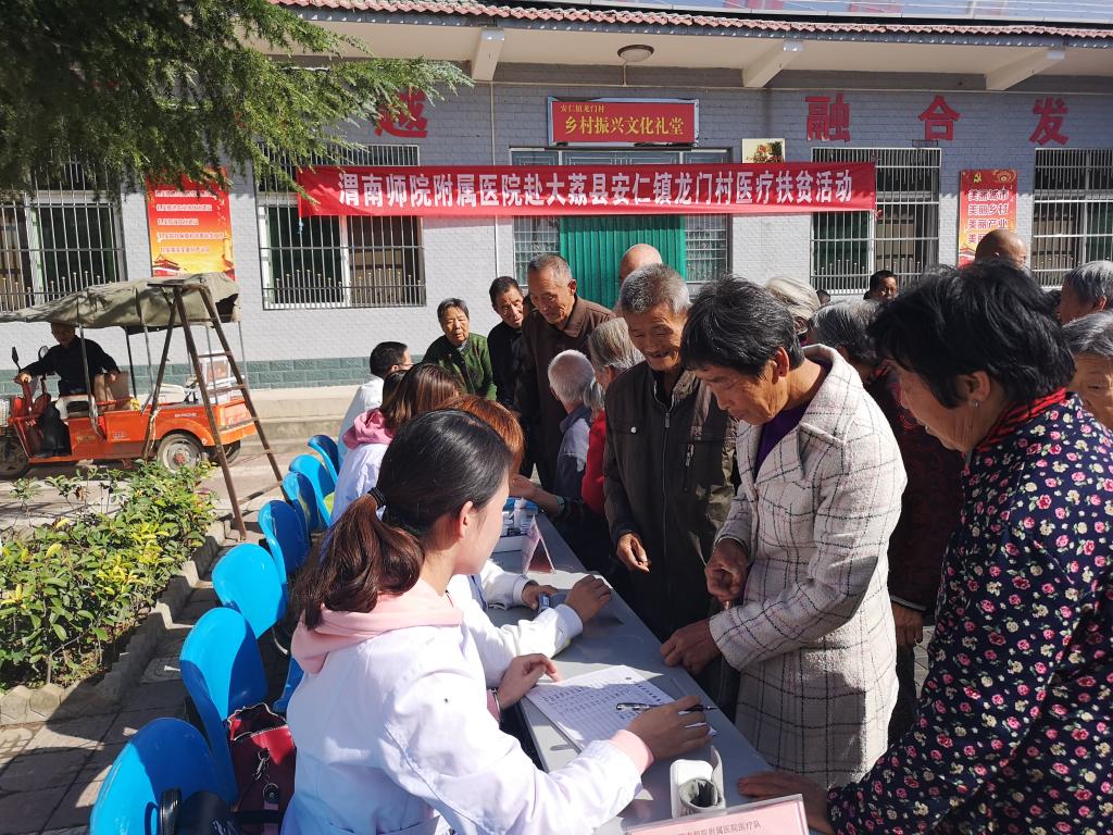 按照学校及科技发展集团公司扶贫工作安排,附属医院于9月29日组成20人医疗扶贫团队,赴大荔县安仁镇龙门村开展送医送药送健康医疗扶贫活动。附属医院前期扶贫工作考察中,经村支部书记介绍,龙门村部分村民因长期饮食含氟量高的水或食物而引起慢性骨骼氟中毒,导致骨质非常致密、硬化,患上氟骨病,村中因病致残的贫困户占到全村贫困户的一半。活动旨在方便村民,零距离诊疗,宣传氟骨病康复知识,防治地方病,提高村民的健康意识,知早治小,指导村民只要避免饮用高氟水,改饮低氟水或尽量去除高氟水中的氟化物,氟骨症是完全可以防治的,提早预防和诊疗,提高生活水平和生活质量,早日脱贫,同迈小康路。