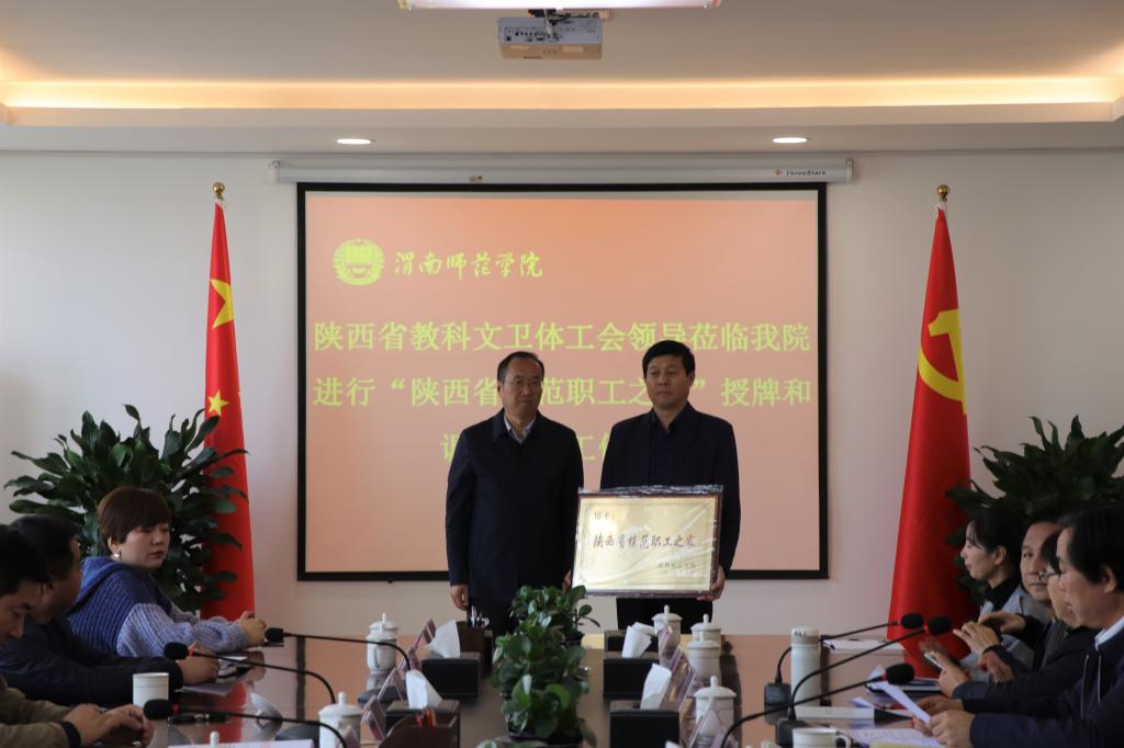 10月30日, 陕西省教科文卫体工会主席陈建树一行莅临bat365官网进行“陕西省模范职工之家”授牌和工会工作调研活动。授牌仪式和调研座谈会在我院厚德楼四楼会议室举行。省教科文卫体工会主席陈建树,省教科文卫体工会副主席陈鹏,bat365官网党委副书记、工会主席任健,院党政办公室副主任张勤恳,工会常务副主席王对启,副主席杨秀香和部分分会主席,教职工代表参加了授牌仪式和座谈会。授牌仪式和座谈会由院工会常务副主席王对启主持。