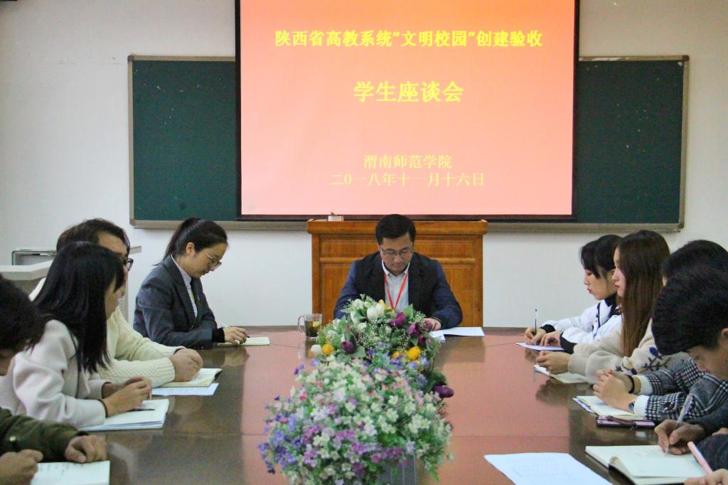 11月16日,陕西省高教系统“文明校园”创建验收专家组莅临bat365官网验收“文明校园”创建工作。专家组由西北大学党委常委、宣传部部长田明纲,西安工程大学国内合作与校友工作处处长杨永革,西安理工大学马克思主义学院院长、教授、博导鲁宽民,西安外国语大学党委委员、宣传部部长赵沛,西安体育学院宣传部部长高月宏组成。