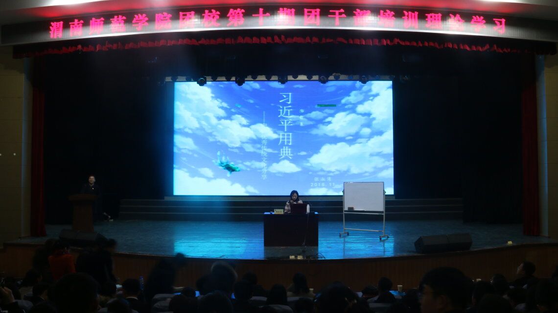启动仪式后,渭南市政府副秘书长张淑隽为同学们作了题为《习近平用典—中国优秀传统文化分享》的报告,她从自强、厚德、立志等方面引导学生研读优秀传统文化典籍,固本培元,以不断提高人生素养与精神境界。校团委办公室主任刘娟宁作了题为《校园文化活动的组织与开展》的讲座,从校园文化的内涵、特点、教育功能、活动开展四个方面详细讲解了校园文化活动对改善校园文化氛围、促进校园文化发展繁荣的重要意义。校团委郭倩作了题为《基层团支部职能与团干部成长》的讲座,从走进共青团、在组织中成长、我是一名共青团干部、团组织的基石-团支部、团的活动五个方面讲解了基层团支部职能与团干部基本功、能力要求。校团委郭艺歌作了《共青团“第二课堂”成绩单网络管理系统“到梦空间”学生端使用手册》操作办法的讲座,细致讲解了部落管理、活动发布、活动管理等。培训中,校团委副书记姚明亮作了题为《习近平总书记关于青年工作的重要思想》的讲座,结合习近平总书记7.2讲话精神和团的十八大会议精神对习近平总书记关于青年工作的重要思想进行阐释,并就bat365官网共青团工作实际、楼宇建团工作实际和团干部职责、素质与能力对团干部提出新的更高要求。(通讯员 郭倩)