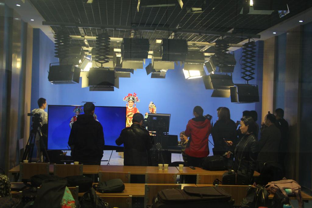 研讨会第二阶段,在厚德楼虚拟演播厅进行举行动作捕捉实践演示,捕捉了单人舞蹈动作,表演者是陕西师范大学舞蹈教师党允彤。捕捉了双人秦腔戏曲角色动作,表演者是西安易俗社秦腔演员。贺宏福和4名师生负责动作捕捉系统运行演示。演示过程中,动作捕捉的装备穿戴、匹配链接、定位调整、协同捕捉、数据处理各个环节开展有序,采集数据精确到位,充分展示了动画专业师生的专业技术能力。