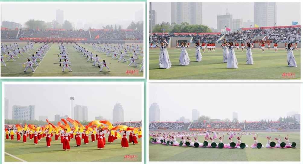 在随后进行的校园体育文化展示中,14支代表队分别展示了第九套广播体操与24式简化太极拳,参与学生们精神充沛,充满自信,动作整齐流畅,姿态优美,充分展示了平时体育训练的成果,彰显了青年学子的青春与活力。展示完成后,各二级学院代表队为全校师生带来了异彩纷呈、独具特色的自选节目表演。自选节目以健美操、啦啦操、韵律操等形式呈现,选题积极向上,爱国奋进,展现追求力与美的体育精神。