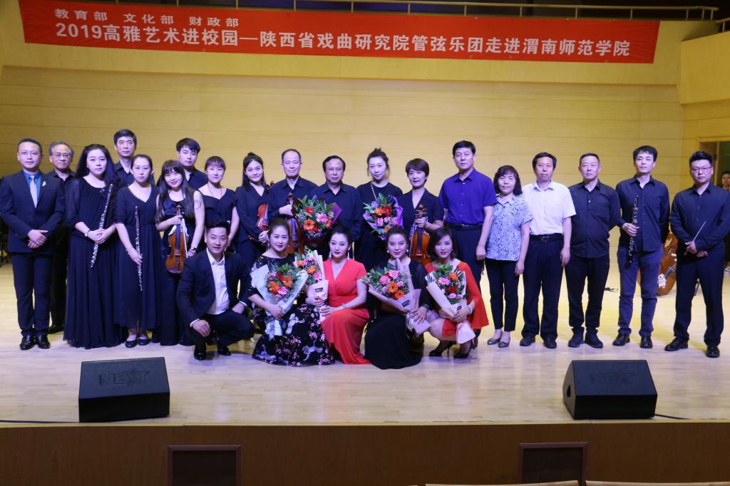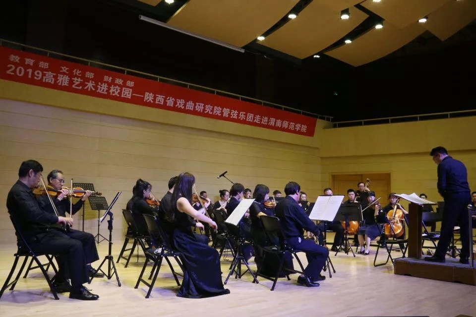 为全面落实习近平总书记在全国教育大会上的重要讲话精神,弘扬主旋律,坚持以美育人,提高广大青年的审美和人文素养,坚定文化自信。6月19日晚,由教育部、文化旅游部、财政部联合主办的2019高雅艺术进校园——陕西省戏曲研究院管弦乐团在bat365官网华金音乐厅成功举办。校党委副书记任健,副校长王菊霞,党委委员、校长助理韩小卫,部分党群部门、二级学院领导及500余名学生观看演出。