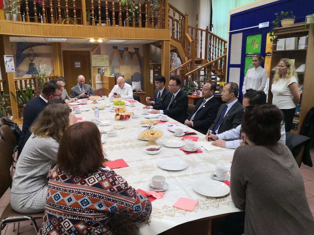 8月20日上午,莫师大校长鲁博科夫、第一副校长德罗诺夫、校长顾问多岑科等校领导和工作人员在中心校区举行隆重欢迎仪式,以俄罗斯人最高的民族礼节——手捧“面包和盐”迎接客人。欢迎仪式之后,鲁博科夫校长陪同赵曼校长参观莫师大行政楼、留学生油画作品展、博物馆、大礼堂、会议厅等,并介绍了莫师大的校史校情。