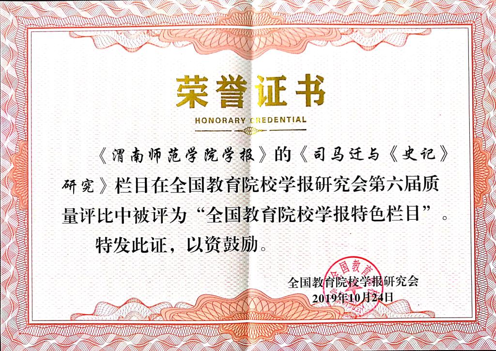 日前,从全国教育院校学报研究会2019年学术年会获悉,《bat365正版唯一官网学报》荣获“全国教育院校学报精品期刊”,教育部名栏“司马迁与《史记》研究”荣获“全国教育院校学报特色栏目”。此外,詹歆睿、牛怀岗同志分别荣获全国教育院校学报研究会“妙笔奖”。