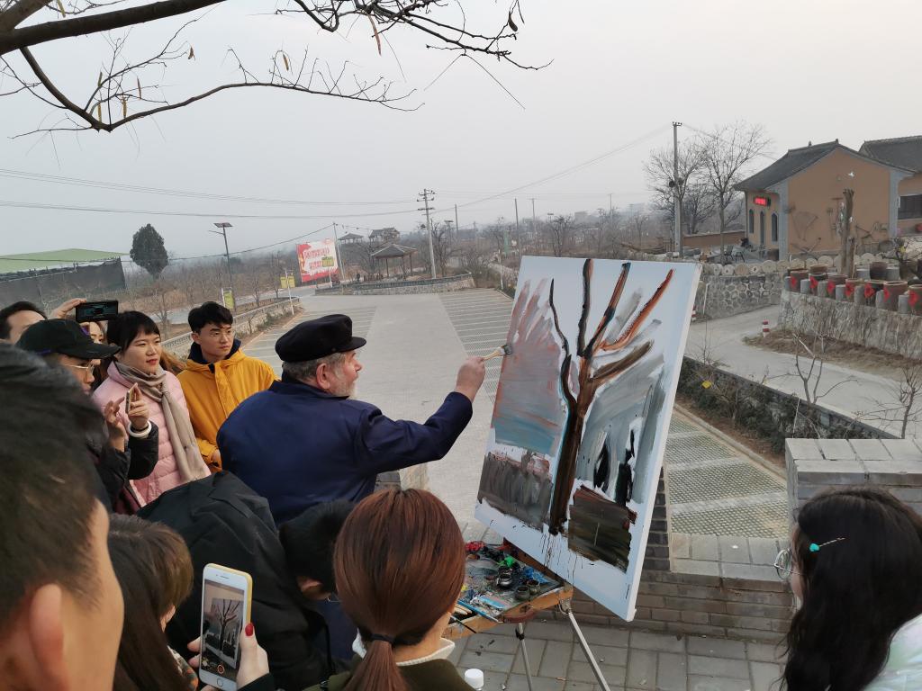 参观后,代表团与师生们一起来到富平县曹村镇写生基地进行创作。卡列宁·维克多副院长现场作画示范教学,一边作画一边与师生交流,给师生讲授取景、构图、油画调色技巧、画面空间等专业知识。卡列宁·维克多副院长还对孙漫平同学的作品进行了点评,提出了改进意见,鼓励学生们努力学习俄语,方便与老师交流。通过观摩油画大师创作和面对面的交流,同学们纷纷表示对油画创作有了更加深刻的认知,受益匪浅。