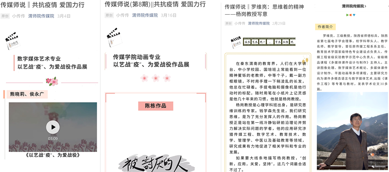 创新载体,建立学院思政新阵地。2020年伊始,新冠肺炎病毒肆虐,疫情防控深入展开,高校师生原地居家抗“疫”,线上教育教学持续推进,二级院系党建与师生思政教育工作主要通过电话、电子邮件、微信、QQ、课程思政等方式“空中”“碎片化”展开。对此,传媒学院党总支围绕立德树人及思政教育工作总要求,依托学院师资力量、专业优势及学院微信公众平台,组织引导党员教师在疫情防控实践过程中,积极开展线上党建及思想政治教育工作探讨与交流,汇集党员教师艺术作品与心得文章,逐步建立起独具传媒学院专业特色的党建与思政教育网络阵地——“传媒师说”。