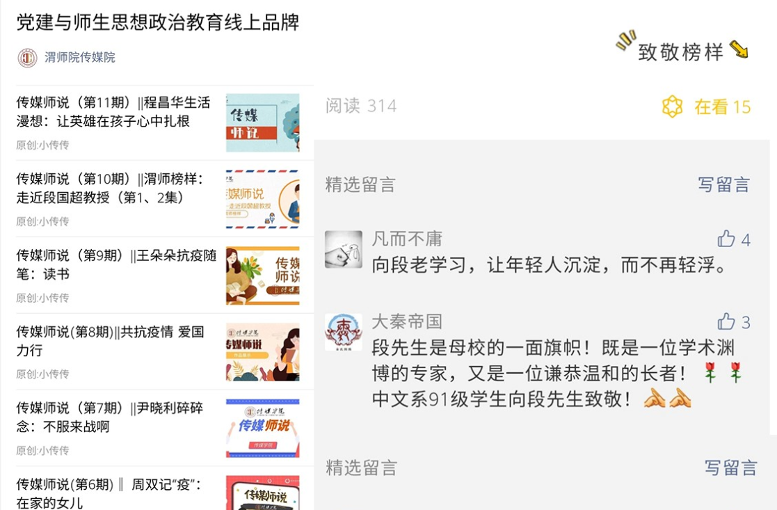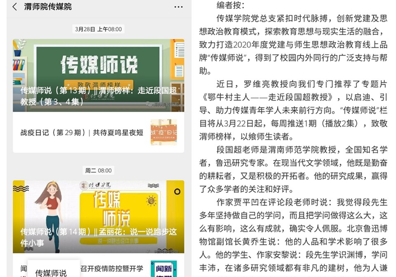 反响良好,教育成效初步显现。“传媒师说”栏目于2020年2月25日正式上线,稿件征集、创新编辑、效果反馈等各项工作有条不紊,进展十分顺利。传媒学院广大党员教师与各届校友纷纷参与,将自己的线上教学心得、思政育人案例、居家抗“疫”体悟、生活点滴所得等凝练创作出的精品佳作,积极投稿分享,栏目的思想引领与教育价值初显成效。截止4月1日,“传媒师说”已发布14期精品内容,包括:学院线上教学工作小记、教授居家生活感悟、青年学人抗疫心得随笔、教师日常体会漫谈等积极向上的多类型内容。其中,栏目还得到了陕西省师德标兵罗维亮教授的大力支持,由罗教授他亲自撰写的人物传记文章《以思维着的精神—杨岗教授写意》首发在“传媒师说”第三期,他推荐的《鄂牛村主人—走进段国超教授》专题片自3月21日开始在本栏目推出,文章及专题片对杨岗和段国超教授的治学思想与人文精神进行了细致阐述和弘扬,对传媒学院的青年教师影响颇大。目前已推出的14期“传媒师说”内容期期精品,得到了学校师生及校内外同行的一致好评。