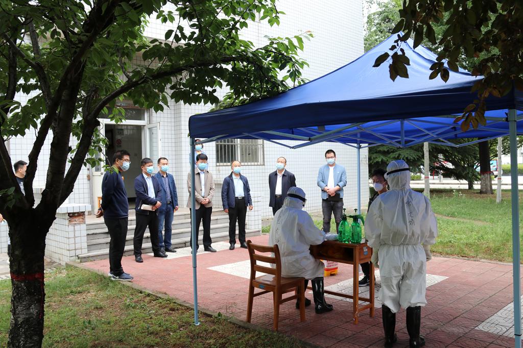 5月8日上午,bat365官网再次组织开展春季开学疫情防控演练活动。校长赵曼,副校长卢爱刚、王菊霞、常青林出席指导。驻渭高校疫情防控第一工作组组长、渭南市卫健委监察专员朱海战,工作组成员市疫控中心刘刚和临渭区教育局刘阳,临渭区疾控中心副主任周展等4人以及市二院副院长张淑珍来校现场指导。