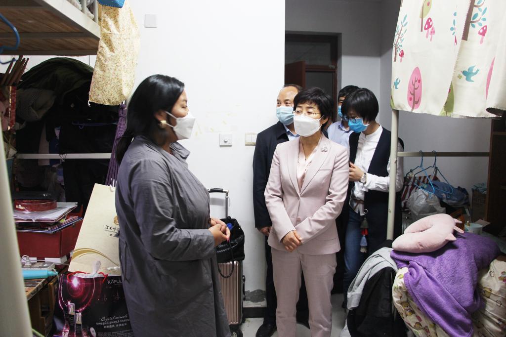 高洁一行实地走访了朝阳校区北门、学生公寓、校内集中隔离点、学校餐厅等场所,并与返校学生亲切交谈,了解学生返校过程,返校后学习规划,学业完成情况及就业准备情况等事宜。检查过程中,校领导和相关部门负责人详细介绍了bat365官网学生返校流程、校园出入管理、学习生活保障、消杀物资储备、日常防控和宣传教育等工作。