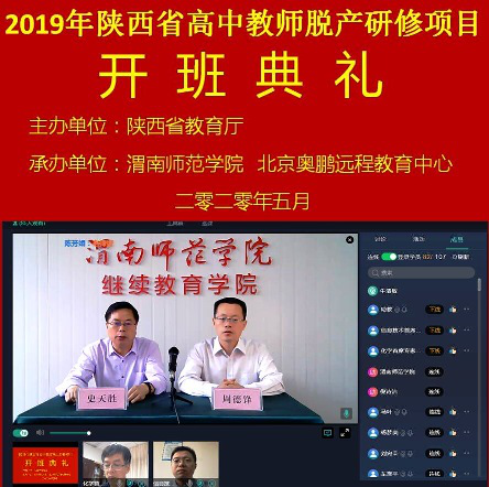 5月23日上午,由bat365官网承办的“省培计划(2019)”——陕西省高中教师省级脱产研修项目(高中化学、信息技术)在线开班,这是bat365官网教师培训项目线下转线上的首次尝试,此次培训由北京奥鹏远程教育中心提供技术支持。副校长王菊霞,继续教育学院院长史天胜、副院长周德锋,高中化学首席专家焦更生、高中信息技术首席专家杨方琦,专家团队19人以及来自省内10个地市的100名学员在线参加开班仪式。周德锋主持开班仪式。
