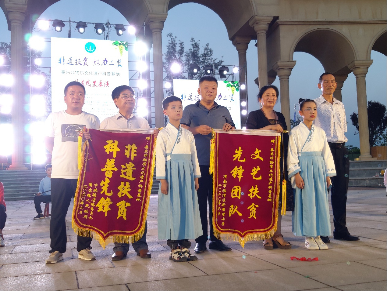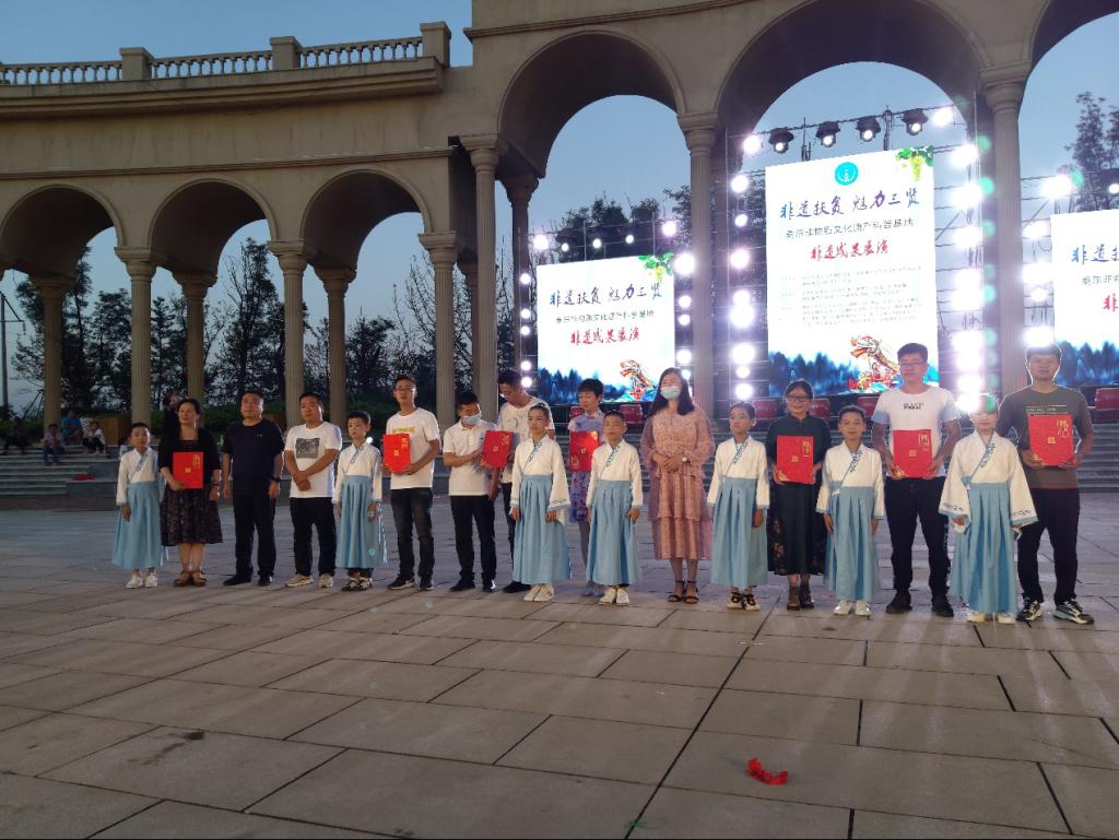 bat365官网科学研究处处长王双喜代表学校致辞。随后,当地镇政府和学校为秦东非遗基地老师授予聘书和锦旗。汇演设有节目表演、书法家题字、非遗传承拜师仪式、非遗科普等多个环节,节目主要由bat365官网杨军燕教授带领青年教师和学生,历经半个多月编排而成。晚会在小学生表演的中国鼓《鼓舞盛世》《张灯结彩》中拉开序幕,其中,大荔官池小学“娃娃老腔团”表演的新编曲目《苦战病毒斗志坚》展示了老腔的传承与时代融合创新的新成果。方言说唱《陕西美食》,独舞《一点甜》,小学生大合唱《送别》,舞蹈表演《阳光下的童年》等节目新颖独特,紧扣主题,现场掌声不断。最后,拜师仪式上青年学子向非遗传承人行敬茶礼成为晚会的最大亮点,这一特殊仪式意义深远,令人起敬。
