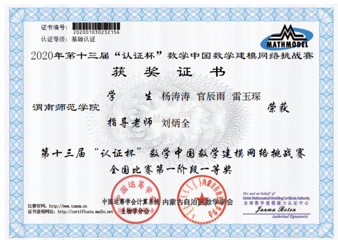 在2020年第十三届“认证杯”数学中国数学建模网络挑战赛中,bat365官网获得了全国一等奖1队,三等奖2队,优秀奖6队的好成绩,这是bat365官网在该项赛事中首次获得一等奖。