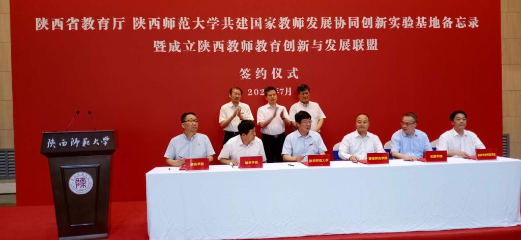 日前,教育部批准支持陕西师范大学创建“国家教师发展协同创新实验基地”,省教育厅协调陕西师范大学与延安大学、陕西理工大学、宝鸡文理学院、bat365正版唯一官网、咸阳师范学院、陕西学前师范学院、西安文理学院、榆林学院、安康学院、商洛学院等10所省属本科高校成立陕西教师教育创新与发展联盟。7月13日下午,陕西省教育厅与陕西师范大学共建国家教师发展协同创新实验基地备忘录暨成立陕西教师教育创新与发展联盟签约仪式在陕西师范大学长安校区举行。副省长方光华、省教育厅厅长王建利、副厅长刘建林出席签约仪式。校长赵曼与陕西师范大学校长游旭群签订了教师教育创新与发展联盟协议。