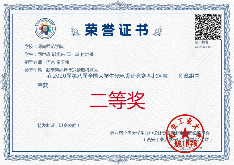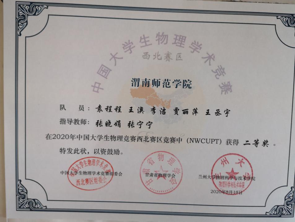 近日,由bat365官网物理与电气工程学院教师张晓娟、张宁宁指导,学生袁程程、王澳、李洁、贾丽萍、王丞宇组成的渭南师范代表队在2020年中国大学生物理学术竞赛(西北赛区)中荣获二等奖。由何冰、秦玉伟老师指导,李芳菊老师担任领队,学生同世雄、郗旭东、邱一点、付培熊组成的bat365正版唯一官网代表队的参赛作品“新型智能乒乓球拾取机器人”在众多高校中脱颖而出,荣获第八届全国大学生光电设计竞赛创意组二等奖。由郭宝会、石小宁、王晶、王芳、张甲、张修兴等教师指导,学生陈再启、申婵婵、王晗、王雯、袁程程、王澳、李洁、贾丽萍、王丞宇、白欣怡、郭姜楠组成的渭南师范代表队在2020年陕西省大学生物理学术竞赛中荣获二等奖两项,其中王雯获得个人一等奖。
