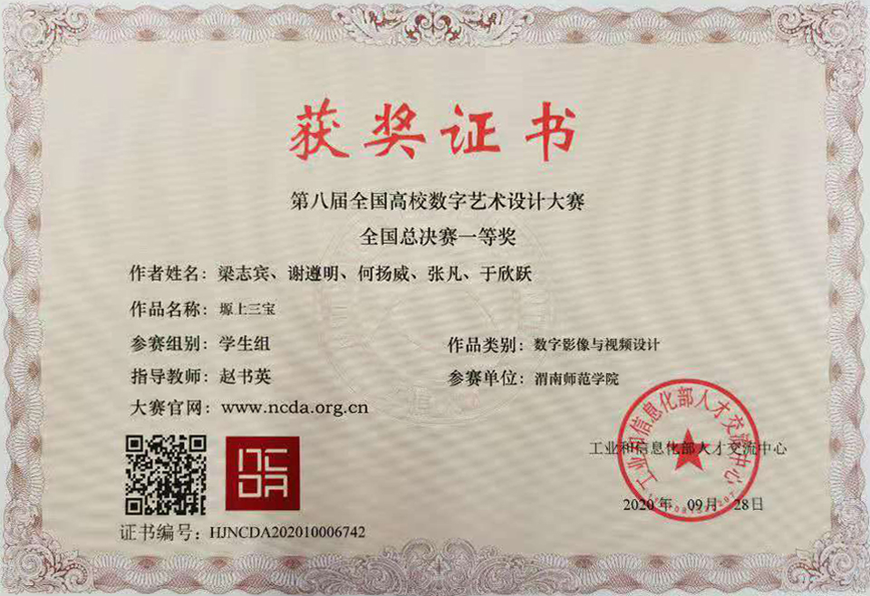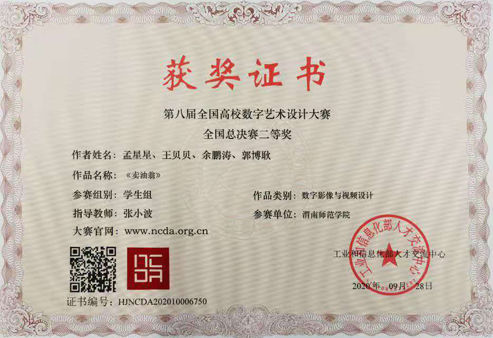 经过校赛、省区赛与国家赛的激烈角逐,由传媒学院教师赵书英指导,梁志宾、谢遵明、何杨威、张凡、于欣跃等同学创作的《塬上三宝》获得全国总决赛一等奖;由张小波指导,孟星星、王贝贝、余鹏涛、郭博耿等同学创作的《卖油翁》获得二等奖;由程昌华指导,褚乐同学设计的《追月》获得三等奖。