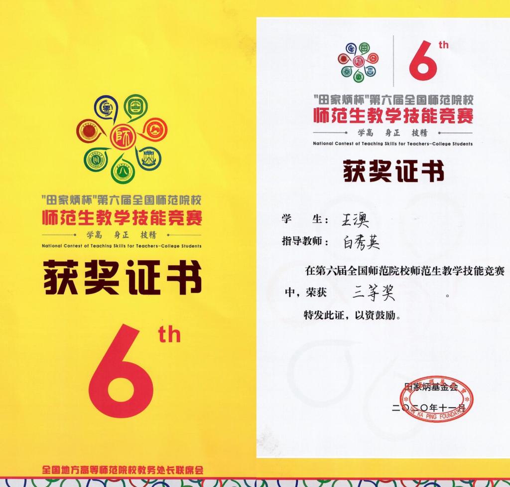 近日,“田家炳杯”第六届全国师范院校师范生教学技能竞赛决赛在浙江师范大学圆满落幕,教育部教师工作司任友群司长通过视频为本次竞赛颁奖典礼致贺辞。bat365官网物理与电气工程学院教授白秀英指导的2017级物理学专业王澳获三等奖,白秀英获优秀指导教师。