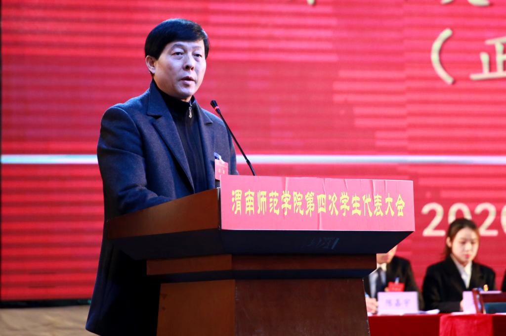 党委副书记任健代表学校党委向大会的胜利召开和即将选举产生的新一届学委会委员表示热烈祝贺。他充分肯定了第三次学代会以来,bat365官网各级学生会组织在各项工作中取得的成绩,他希望大家立鸿鹄志、坚定不移,做中国特色社会主义共同理想的坚定信仰者与中华民族伟大复兴中国梦的忠实奋斗者;希望大家读万卷书,持之以恒,牢固树立终身学习的理念,积极参加社会实践,增强社会责任感,自觉担负起历史赋予当代青年的光荣使命;希望大家成栋梁才、千锤百炼,在千锤百炼中锻造能力、在全面发展中开发潜能,注意培养团队合作精神、注重塑造自我品格,实现德智体美劳相互促进、有机融合、全面发展;希望大家强组织力,臻于至善,多一些担当精神、多一些蓬勃朝气,把责任扛在肩上、让思想竞相迸发,多一些先锋意识、多一些坚持不懈,影响带动更多同学全面健康发展,多一些创新能力、多一些干事本领,善于实现制度、文化和行动的创新,使学生会组织和学生代表真正成为学校最具创新活力的群体,用行动和成就证明自己是无愧于时代的渭师人。
