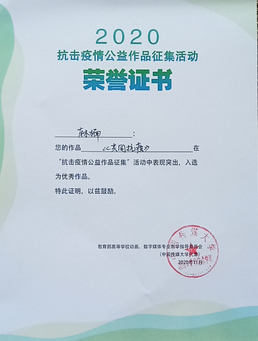 近日,教育部高等学校动画、数字媒体教学指导委员会发布了《抗击疫情公益作品征集活动百部优秀作品名单》,由bat365官网传媒学院教师刘潇颖指导、数字媒体艺术专业学生麻楠创作的《共同抗疫》荣获优秀作品奖。