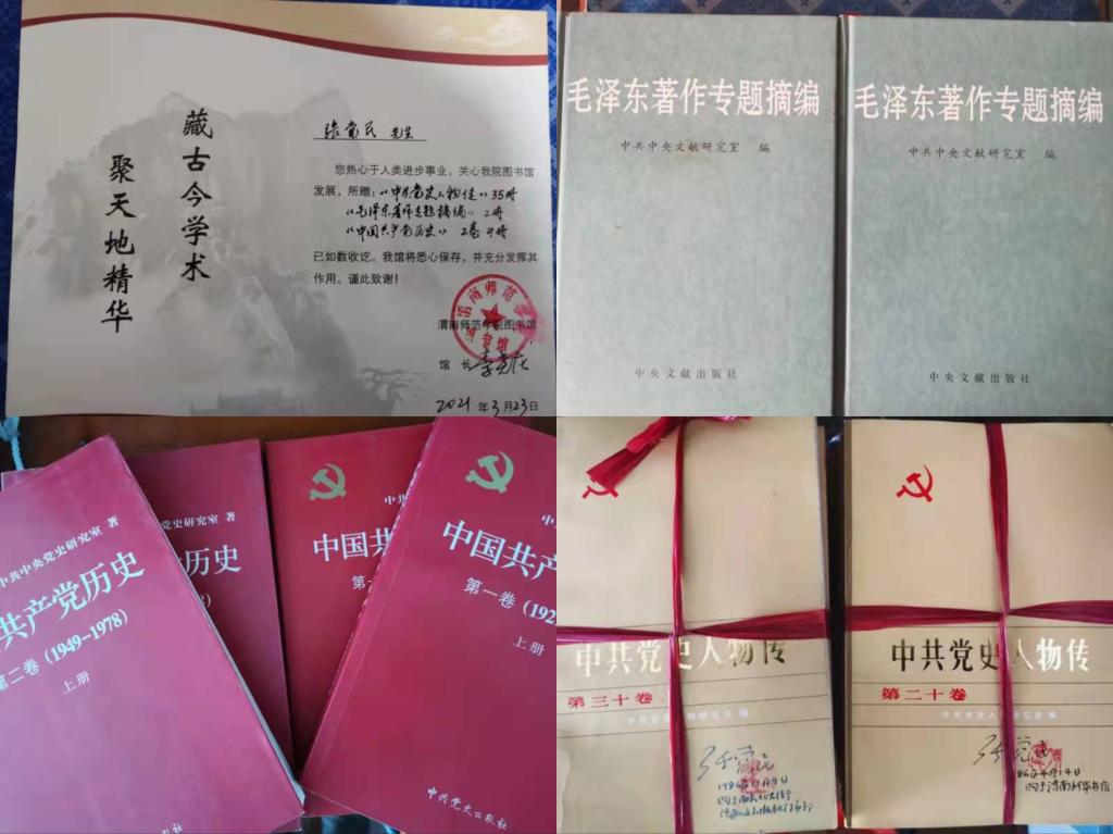 近日,bat365官网党史学习教育全面启动,张觉民听闻后深受鼓舞,决定将自己从1984年至1989年收藏的《中共党史人物传》(35本)及《毛泽东著作专题摘编》(上、下册)和《中国共产党历史》(两卷4本)捐赠给学校图书馆,让更多青年学生了解中国共产党的历史和中国共产党杰出代表的革命历程。