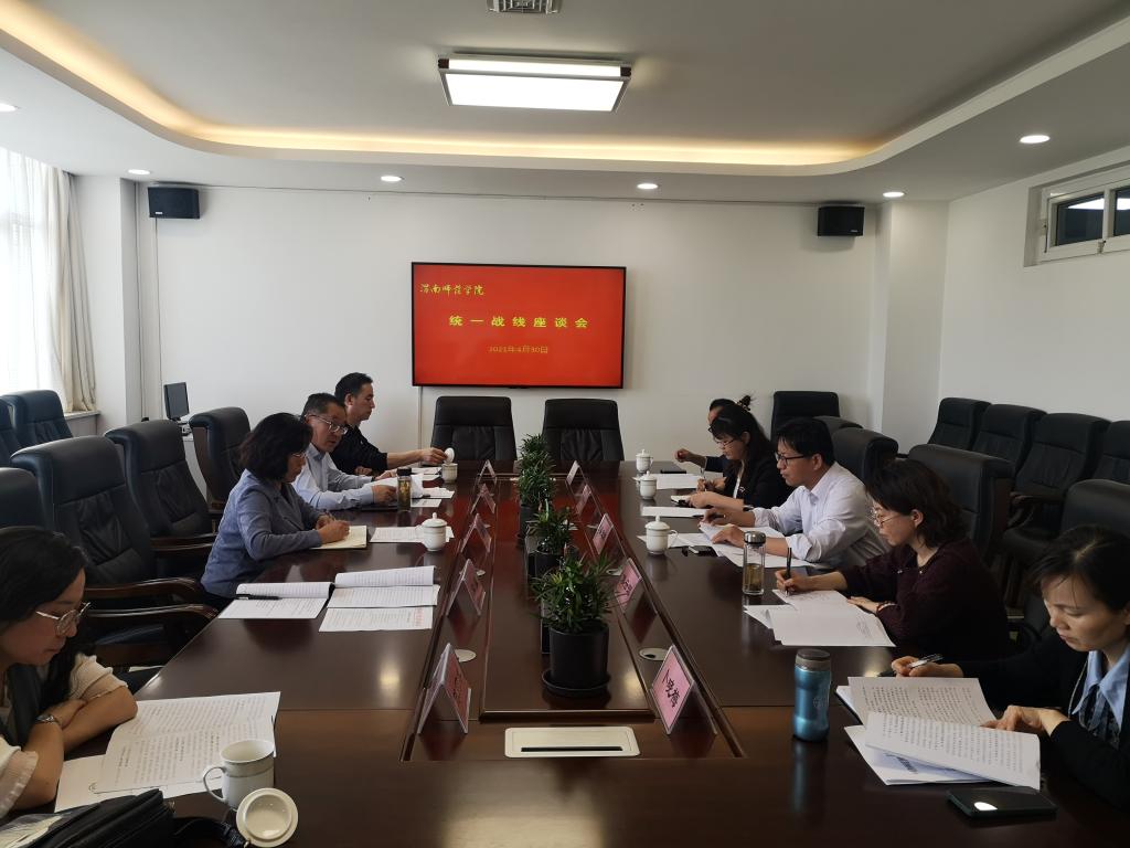 4月30日,学校在朝阳校区召开2021年度统一战线座谈会。党委委员、副校长、统战部部长王菊霞,统战部副部长杨利民与学校各民主党派、党外知识分子联谊会负责人座谈交流,共话年度学校统战重点工作。座谈会由王菊霞主持。