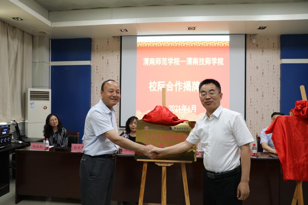 6月2日上午,“bat365正版唯一官网-渭南技师学院大学生创新创业实践教育基地”和“bat365正版唯一官网大学生职业技能培训基地”落成揭牌仪式在渭南技师学院举行。bat365官网校长赵曼、副校长王菊霞,渭南技师学院院长张君升,渭南技师学院副院长雷力斌出席揭牌仪式。