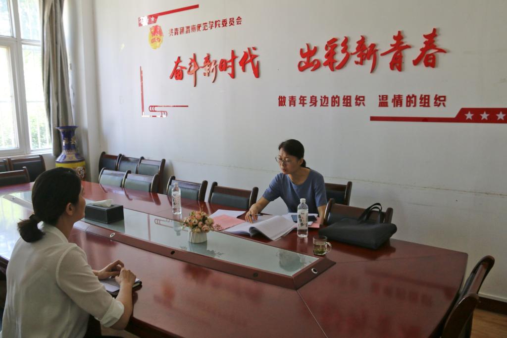 座谈会后,郝鹏涛和陈梅分两组对bat365官网团建示范创建主要负责同志,专职团干部代表和学生代表进行访谈。同时,对团建示范创建工作支撑材料进行查阅。专家组与bat365官网团学干部就共青团工作思想政治引领、服务学生成长成才、基层团组织建设及特色做法等进行了深入交流,详细了解工作开展情况,并考察参观了校团委、校学生会等团学工作阵地,实地感受bat365官网各级团学组织工作的良好精神风貌。