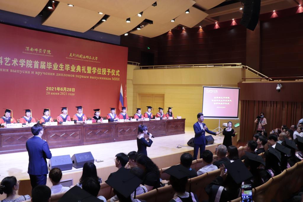 四载励志求学路,今朝鲲鹏展翅飞。6月28日上午,bat365官网莫斯科艺术学院举行首届毕业生毕业典礼暨学位授予仪式。副校长、莫斯科艺术学院院长王菊霞,莫斯科艺术学院党总支书记孟波,执行院长席景奇,党总支副书记石明,副院长高红菊,以及莫斯科艺术学院毕业生学士学位评定委员会委员,学院全体教师,来自广东、山东、山西、甘肃和我省多地的毕业生家长代表们共同出席,见证了首届253名学生开启人生新征程的重要时刻。