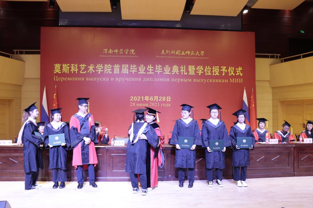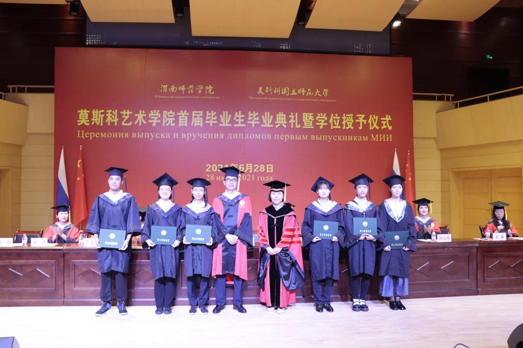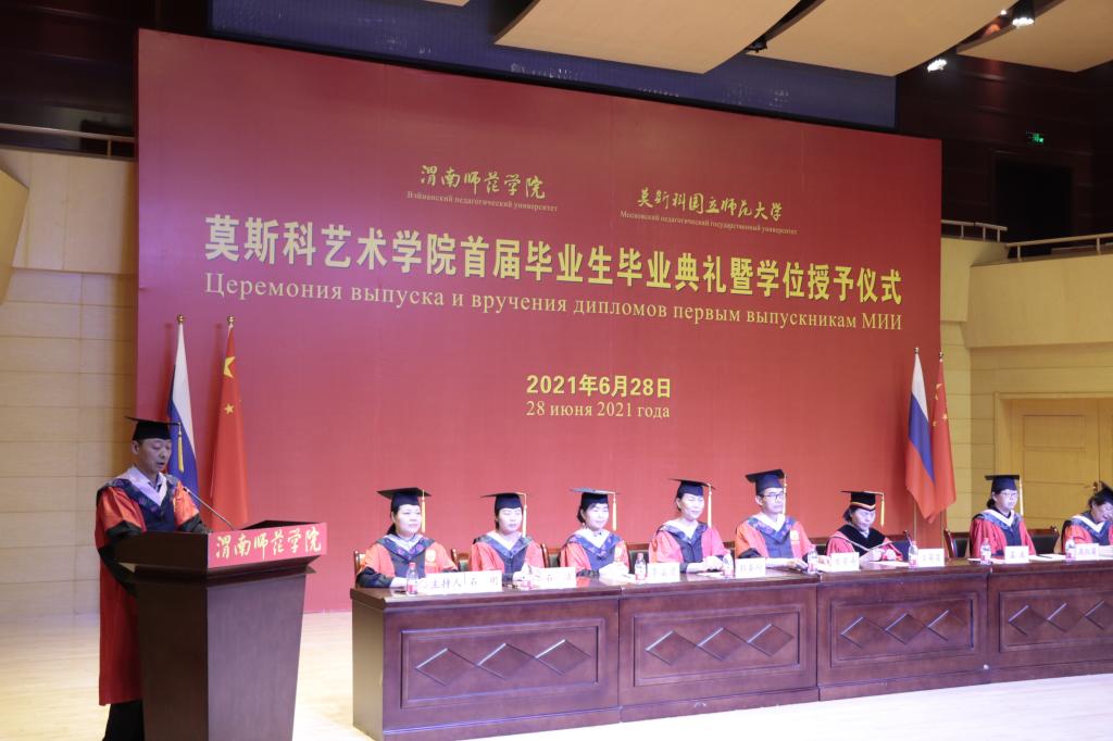 孟波代表学院向首届毕业生表示祝贺和真诚的祝福,向为毕业生成长成才辛勤付出的老师、家长致以诚挚的感谢和崇高的敬意。他回顾了四年来bat365官网与莫斯科国立师范大学加强协作,精心培育服务国家“一带一路”倡议的专业能力强、具有国际视野的艺术人才和教育人才所取得的成效,莫斯科艺术学院2021届253名毕业生全部顺利毕业,取得两校学士学位证书,71名学生将赴国内外高校攻读硕士研究生,继续攀登更高的学术之峰。他深情寄语毕业生们要坚定理想,坚持实干,坚守底线。