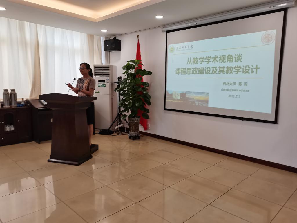 专家报告环节,陈莉作了题为“从教学学术视角谈课程思政建设及其教学设计”的精彩报告。她从“教学学术”理念出发,阐明了教师教学的科学性与专业性,梳理了“思政课程”与“课程思政”的历史脉络,从国家相关政策文件与国家领导人讲话精神的梳理中清晰展示了思政课程与课程思政的联系与区别,详细解读了《高等学校课程思政建设指导纲要》,指导参会教师学懂弄通课程思政的精神实质与基本要求。陈莉从自己讲授的“算法分析”课程为例,分享了教学学术深钻细研、课程思政启智铸魂、立德树人润物无声的创新理念与成功实践。