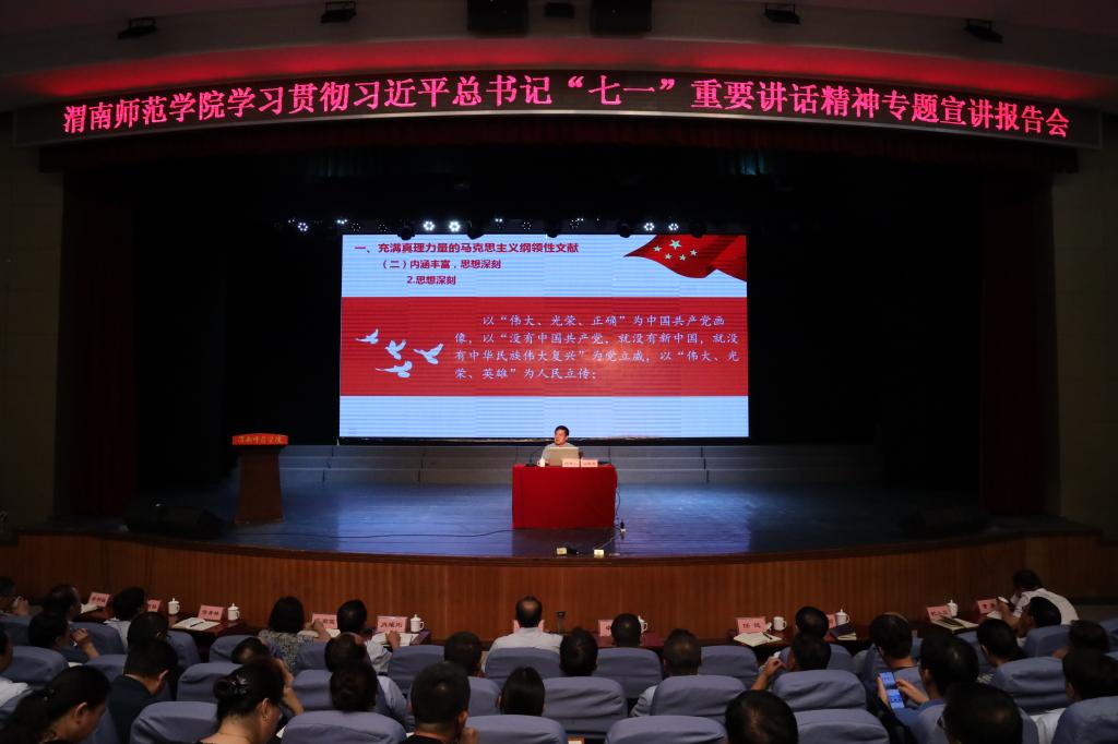 7月7日下午,学校在陶然楼演艺厅举办了学习贯彻习近平总书记“七一”重要讲话精神专题宣讲报告会。党委委员,党史学习教育领导小组成员、督导组成员、领导小组办公室成员,副科级以上干部和100余名师生党员代表参加。