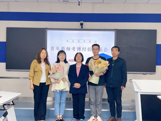 与会教师就考博中常见的导师联系、研究计划等问题与他们做了讨论交流。学院领导为两位年轻的老师送上祝福的花束。