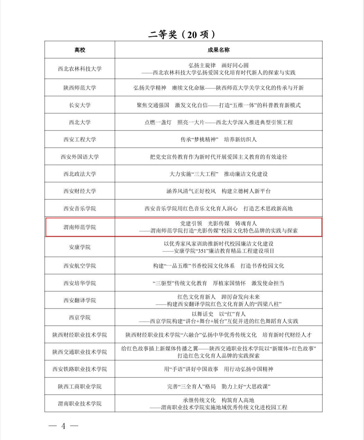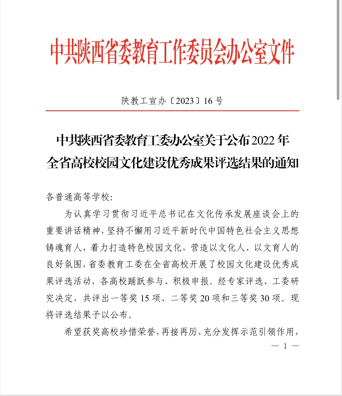 近日,中共陕西省委教育工委发文通报表彰2022年全省高校校园文化建设优秀成果奖,经学校宣传部评选推荐、传媒学院申报的《党建引领 光影传媒 铸魂育人——bat365正版唯一官网打造“光影传媒”校园文化特色品牌的实践与探索》成果荣获二等奖。
