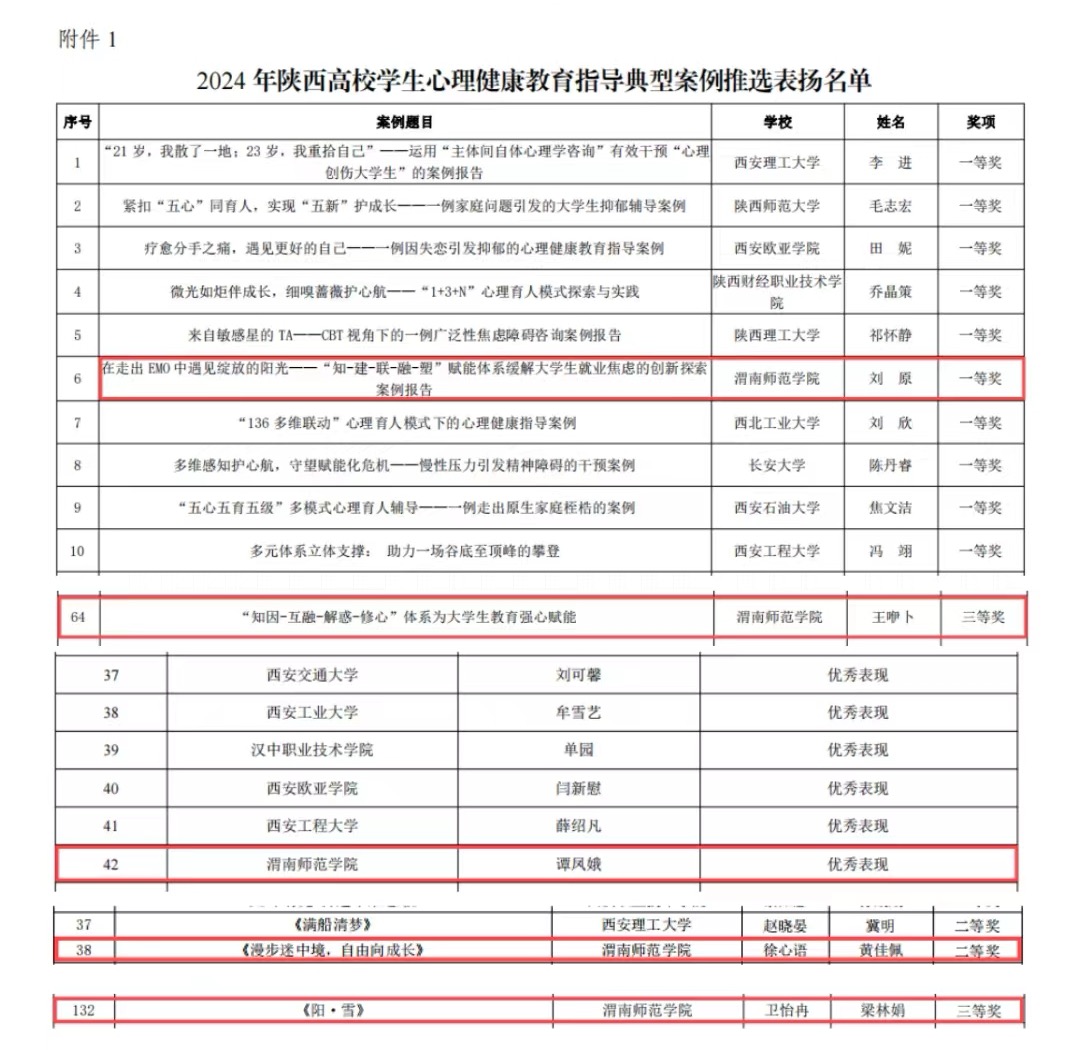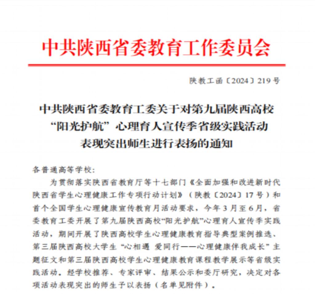 近日,陕西省委教育工委公布了第九届陕西高校“阳光护航”心理育人宣传季实践活动的评审结果。经校内评选、学校推荐、专家评审、委厅审定、结果公示等程序,bat365官网师生共斩获5项奖项,分别是2024年陕西高校学生心理健康教育指导典型案例一等奖(1项)、三等奖(1项),第三届陕西高校学生心理健康教育课程教学展示活动优秀奖(1项),第三届陕西高校“心相遇 爱同行——心理健康教育伴我成长”主题征文二等奖(1项)、三等奖(1项)。