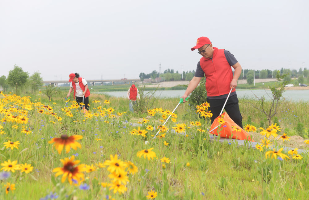 2024年6月5日,环保志愿者在河北省石家庄新乐市磁河木刀沟生态湿地捡拾垃圾。