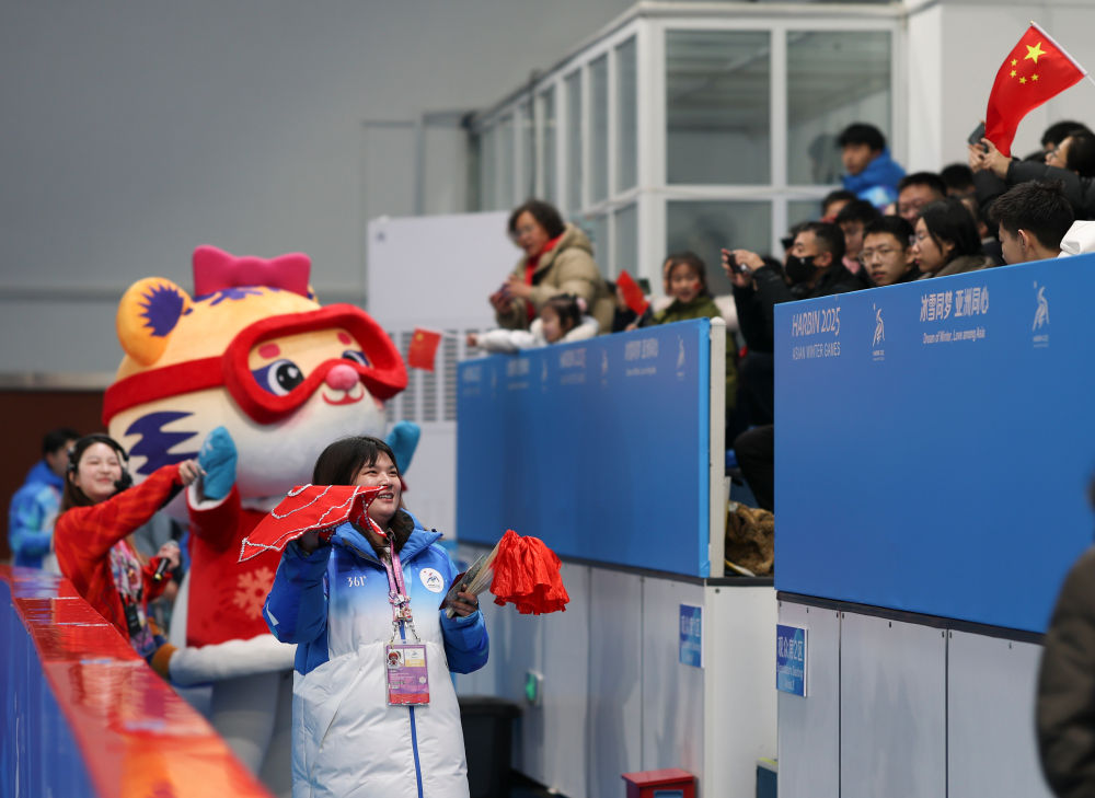 2025年2月11日,志愿者和吉祥物“妮妮”在第九届亚冬会的一场比赛前与观众互动。