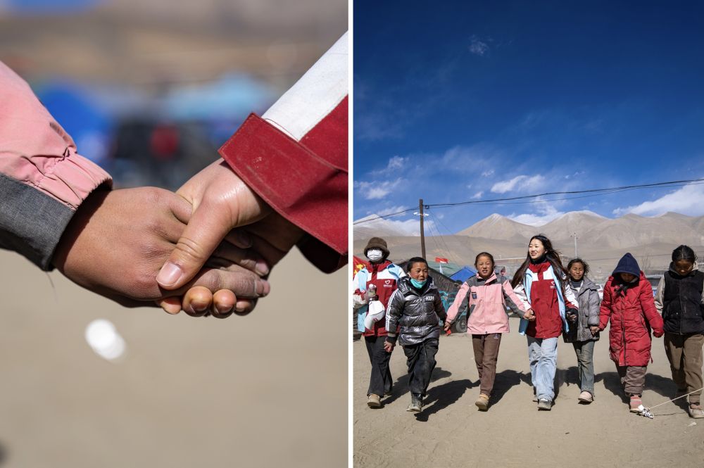 在西藏日喀则市定日县长所乡森嘎村,西部计划志愿者周涟笛和地震灾区孩子们在一起,帮助他们疏导心理(拼版照片,2025年1月13日摄)。新年伊始,一场突如其来的地震打破了高原的宁静。众多志愿服务力量紧急奔赴,为受灾群众带来温暖和力量。