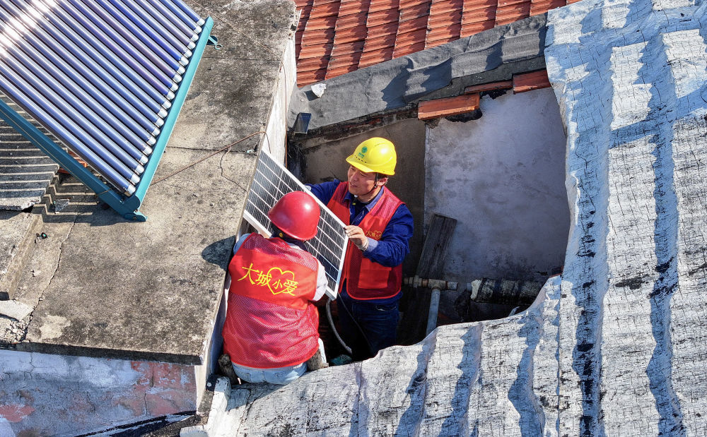 2025年3月2日,浙江余姚大城小爱公益服务中心志愿者在一老旧小区开展太阳能照明公益改造,照亮老社区居民的回家路(无人机照片)。