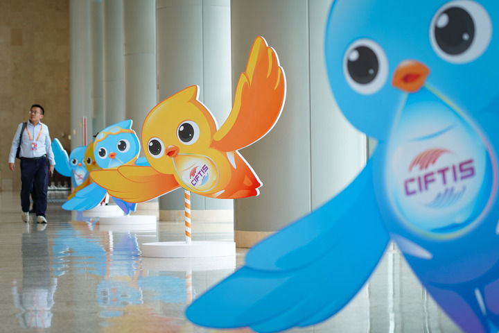 2024年9月11日在国家会议中心拍摄的服贸会吉祥物“福燕”形象。新华社记者 陈钟昊 摄