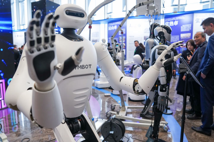 2025年2月14日在2025年苏州市“人工智能+”创新发展推进大会暨人工智能赋能新型工业化深度行(苏州站)活动现场拍摄的人形机器人。新华社记者 李博 摄