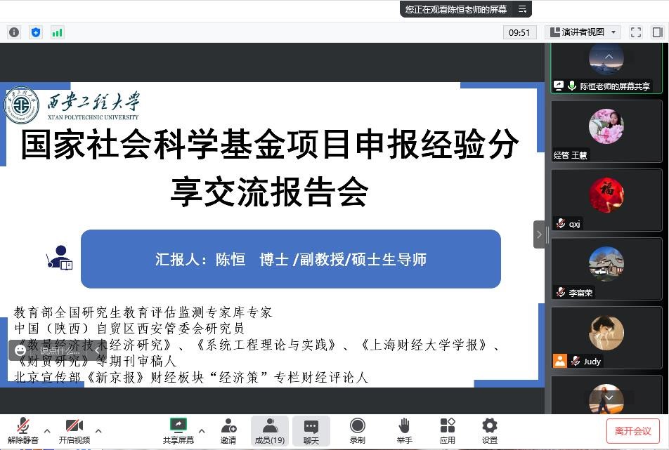 11月11日下午,经济与管理学院邀请西安交通大学博士、西安工程大学副教授、硕士生导师陈恒在线为教师作国家社会科学基金项目申报经验分享与交流报告,报告会由经济与管理学院副院长屈晓娟主持,院长李富荣与学院40余名教师聆听了此次报告。